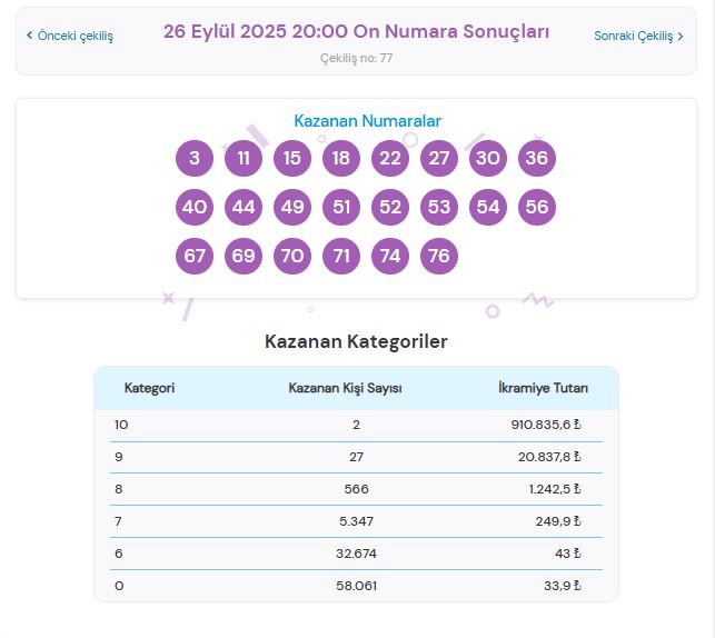 Milli Piyango İdaresi tarafından düzenlenen On Numara çekilişi 26 Eylül 2025 Cuma günü saat 20.00’de gerçekleşti. Çekiliş, Milli Piyango TV YouTube kanalında canlı olarak yayınlandı.