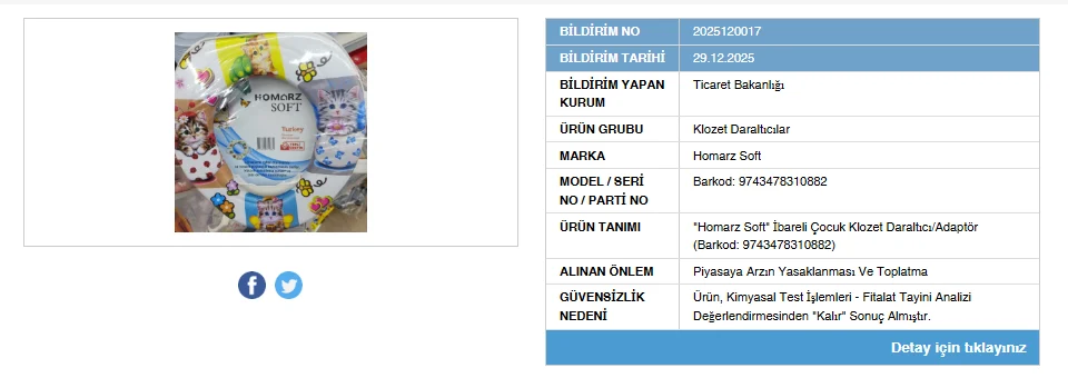 Bakanlık tarafından yürütülen piyasa gözetimi ve denetimi çalışmaları kapsamında yapılan incelemelerde, Homarz Soft markasına ait klozet daraltıcı ürünün çocuklar için sağlık riski oluşturduğu tespit edildi. Yapılan testler ve teknik değerlendirmeler sonucunda ürünün ilgili güvenlik standartlarını karşılamadığı bildirildi.