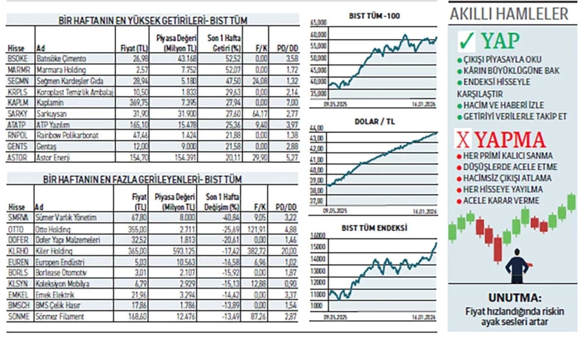 Endeksin %3,83’lük huzurlu yükselişi borsanın sakin deniz olduğu yanılgısına yol açabiliyor. Ancak haftalık yüzde 50’yi aşan getiri ve %40’ı bulan çöküşler, borsanın fırtınası bitmeyen okyanus olduğunu hatırlatıyor.