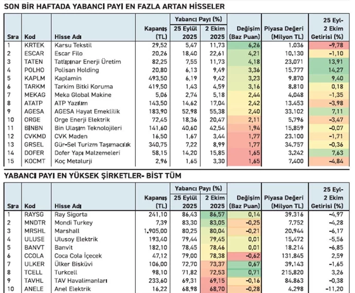 25 Eylül–2 Ekim tarihleri arasında yabancılar 15 hissede paylarını artırırken altı hissede artış 3 puanın üzerinde gözlendi. En yüksek artış 6 puan ile tek bir hissede yaşandı. Hissenin fiyatı ise bu sürede %10 geriledi.