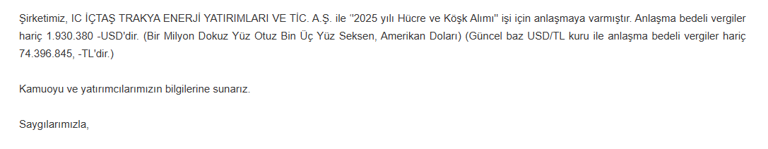 Girişim Elektrik, IC İçtaş Trakya Enerji ile 2025 yılı hücre ve köşk alımı için 1,93 milyon dolarlık sözleşme imzaladı.