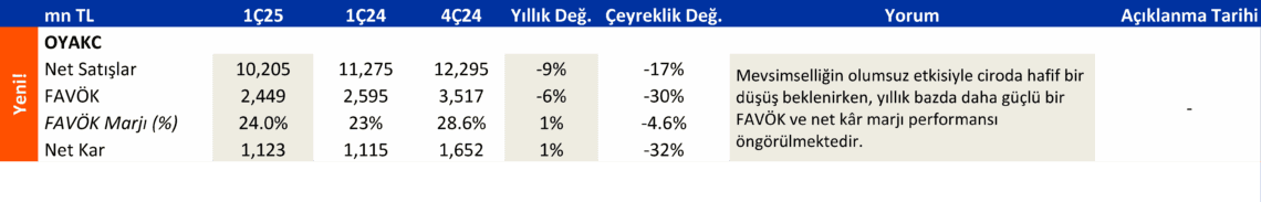 İş Yatırım, Oyak Çimento (OYAKC) 2025 1. Çeyrek Bilanço Beklentisini Açıkladı