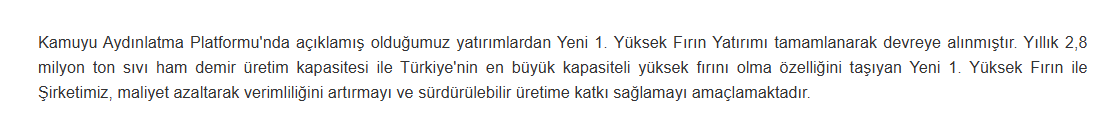 İskenderun Demir ve Çelik A.Ş. (ISDMR), Kamuyu Aydınlatma Platformu’na (KAP) yaptığı bildirimle, yeni yüksek fırın yatırımını tamamladığını ve devreye aldığını duyurdu.