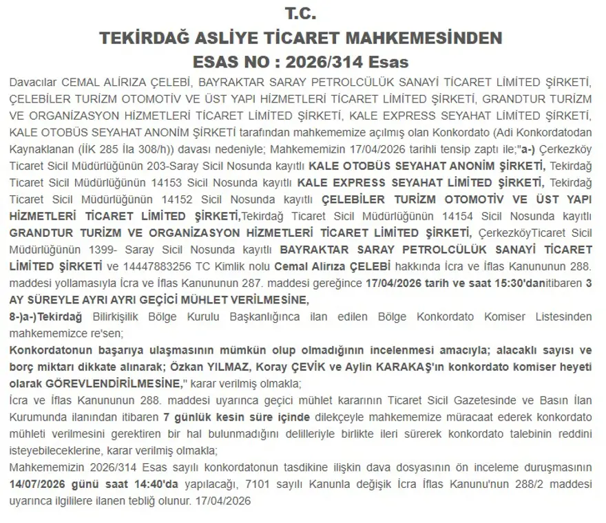 Karar kapsamında Cemal Alirıza Çelebi, Bayraktar Saray Petrolcülük, Çelebiler Turizm Otomotiv, Grandtur Turizm, Kale Express Seyahat ve Kale Otobüs Seyahat de konkordato sürecine dahil edildi.
