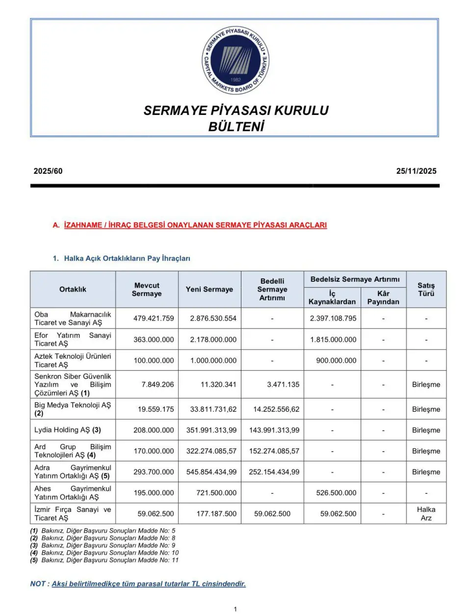 SPK, 25 Kasım 2025 bülteninde dört şirkete bedelsiz sermaye artırımı onayı verdi. Oba Makarna, Efor, Aztek ve Ahes GYO yüksek oranlı bedelsizler açıklarken, İzmir Fırça’ya hem bedelli hem bedelsiz onayı çıktı.