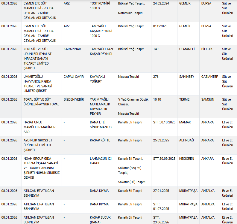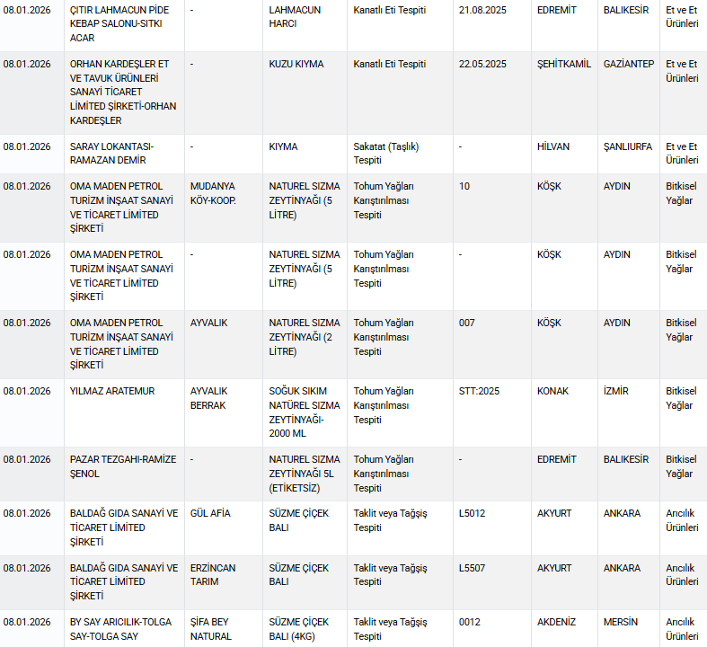 Bakanlığın internet sitesinde “Sağlığı tehlikeye düşürecek gıdalar” ile “Taklit ve tağşiş yapılan gıdalar” başlıkları altında firmalar, markalar ve ürünlere ilişkin detaylar yer alıyor. Son güncellemede listeye eklenen 22 yeni ürün arasında bal, yoğurt, kıyma ve zeytinyağı gibi temel tüketim ürünleri bulunuyor.