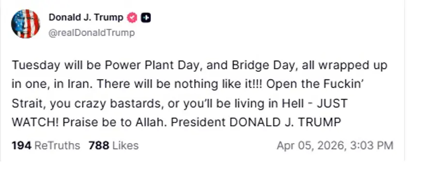 Trump, Hürmüz Boğazı’nın açılması için verdiği sürenin dolmak üzere olmasına gönderme yaparak yaptığı paylaşımda, “Salı günü İran'da hem Enerji Santrali Günü hem de Köprü Günü aynı gün kutlanacak. Bunun gibisi bir daha olmayacak! Lanet olası boğazı açın, sizi deliler! Yoksa cehennemde yaşayacaksınız! İzleyin! Allah'a şükürler olsun!” ifadelerini kullandı.