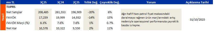 Raporda, Tüpraş’ın 2025 yılı 3. çeyreğinde (3Ç25) şu bekletiler paylaşıldı: