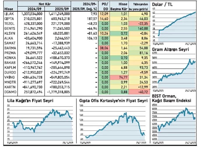 Mayıs 2024’te borsaya gelen Lila Kağıt, dokuz aylık dönemde 1,4 milyar TL ile sektörde en yüksek kârı açıkladı. Satışlarını %18 düşürmesine rağmen 525,5 milyon TL sabit kıymet satışından elde ettiği gelir, dönem sonu kârın %8 artmasında belirleyici oldu. Hisse, halka arz fiyatının altında işlem görüyor.
