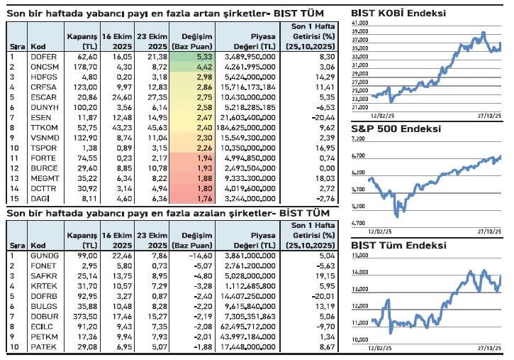 Yabancılar 16–23 Ekim tarihleri arasında en fazla Dofer Yapı’da paylarını artırdı. Alımlarla payları 5,33 puan yükselirken Oncosem’deki payları da 4,42 puan arttı.